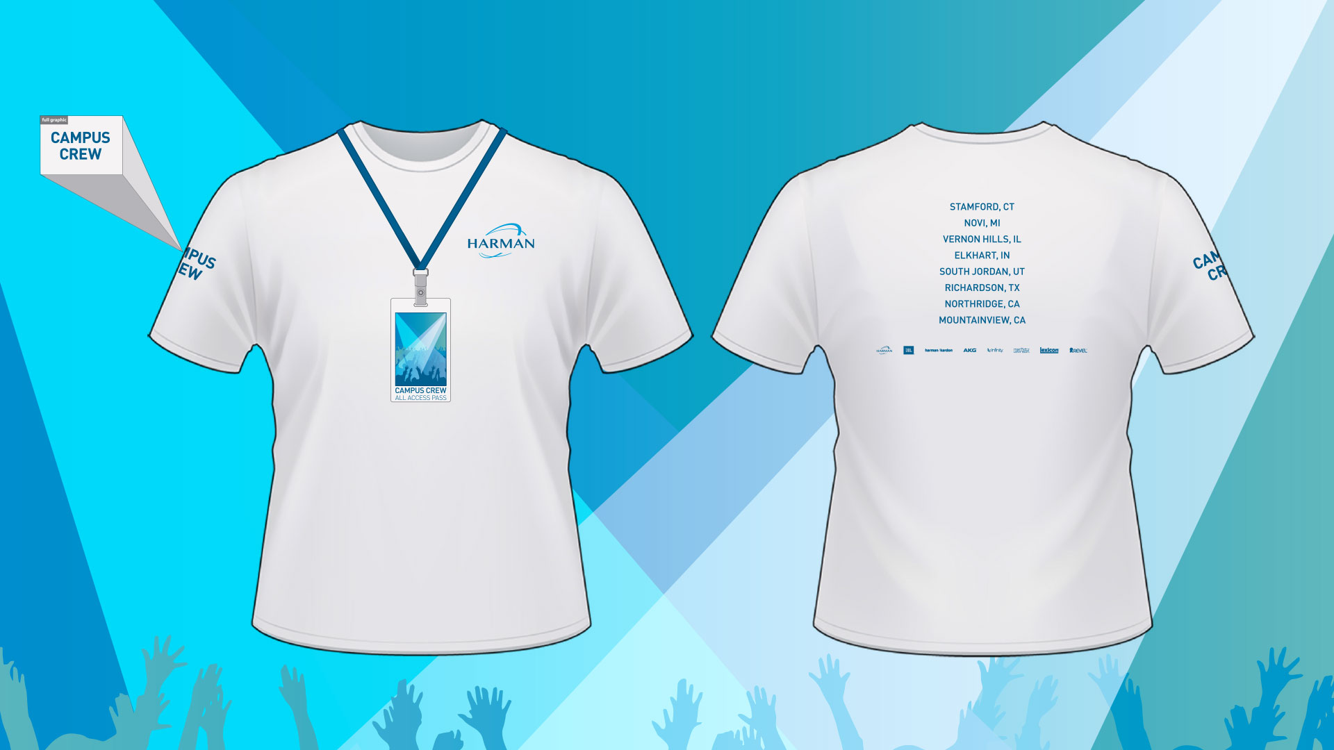The white Harman 'Campus Crew' shirts, following the Harman guidelines, sported a two color logo on the front. Mimicking concert t-shirts, the back has a list of the city's the recruitment events took place, followed a standard lock-up list of brands under the Harmen brand.