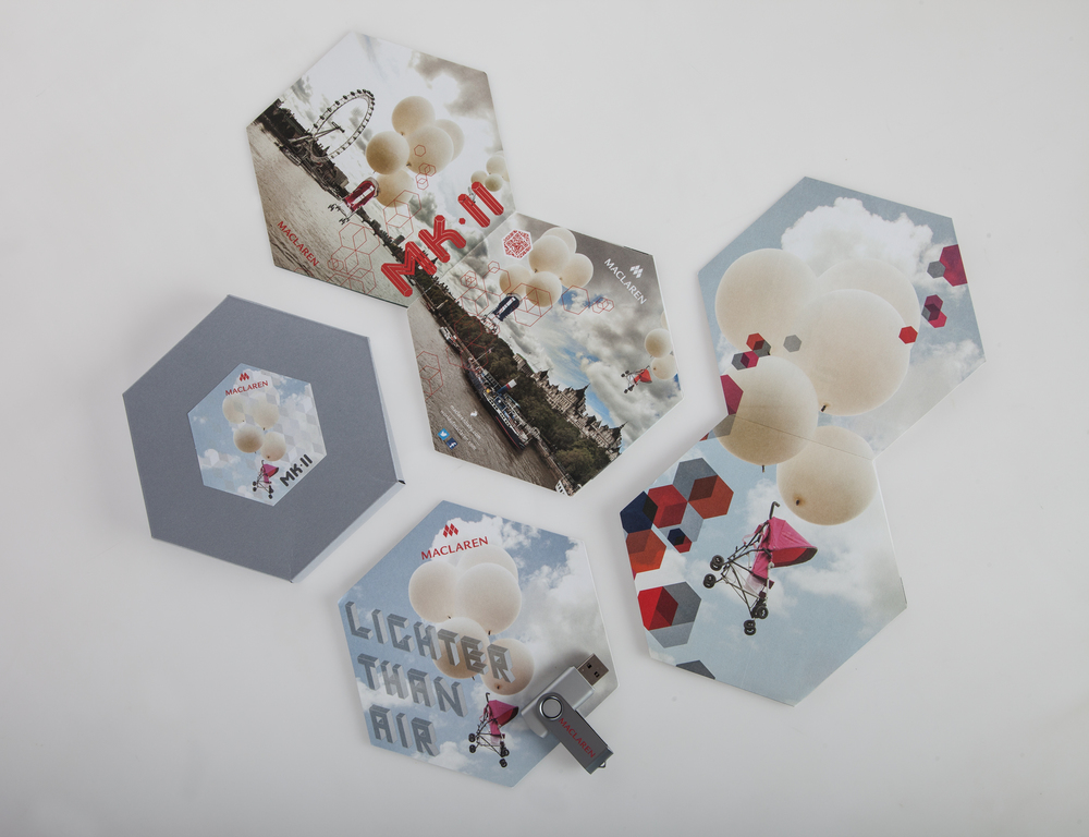 Custom press package envelope with print and digital promotional materials for venders. Package includes: die-cut cover sheet, accordion-folded brochure, and Maclaren branded USB with digital assets.