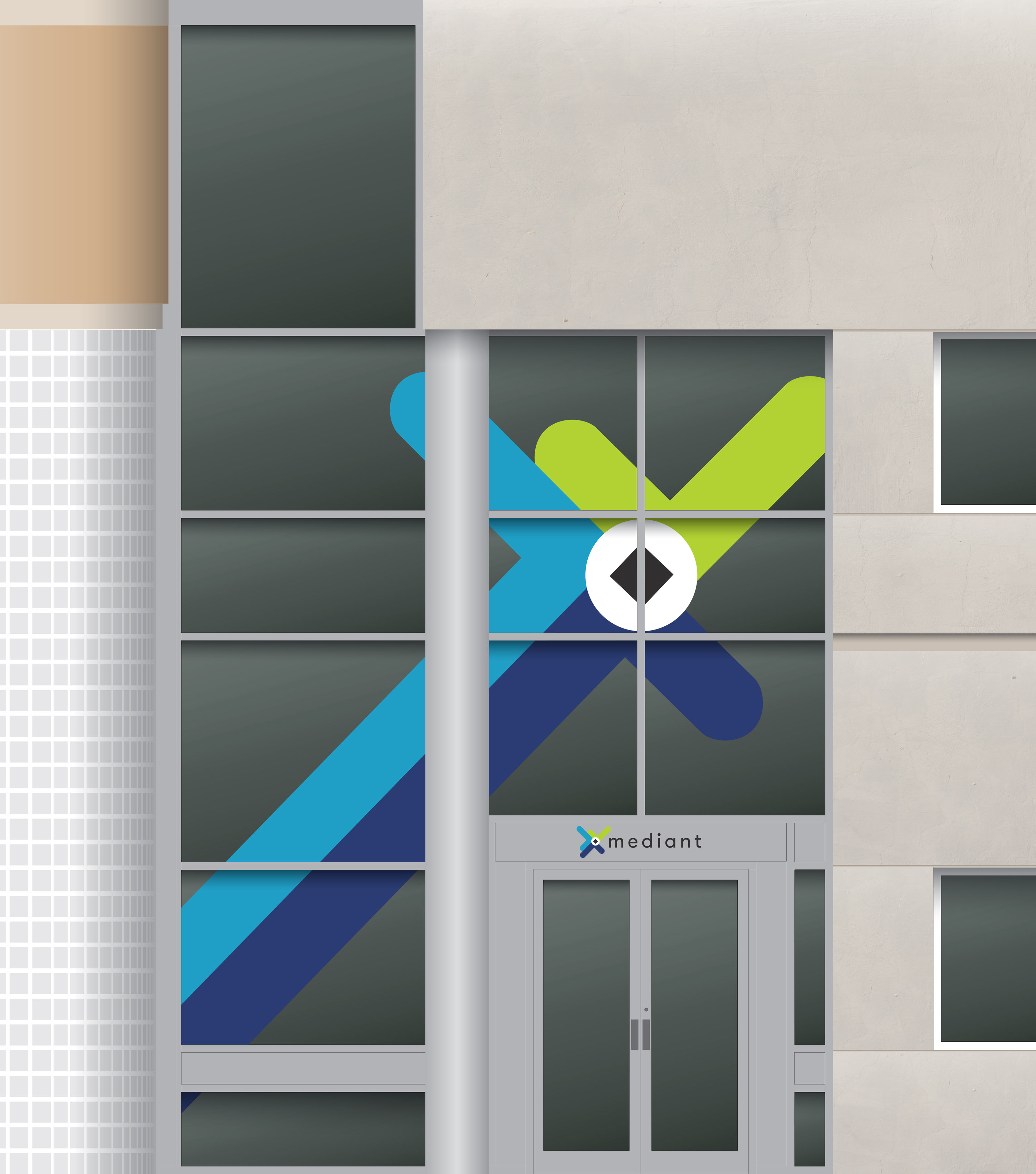 In late-2016, the originally named "Mediant Communications" rebranded it self "mediant," which came with a shinny new logo. Desai Communications, was tasked in the design and creation of new signage for Mediant's New fulfillment center in Wayne, New Jersey. Originally a door signage brief, the combination of scale, in the form of two stories of glass, and design opportunities the project grew in scope.